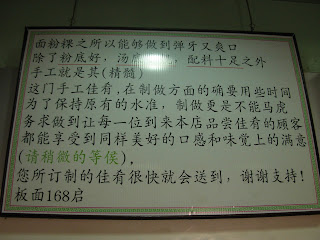 首先, 老板特地在店内挂了一幅白纸黑字, 写着168的板面乃纯手工制着,现做现煮,费时费力, 故请客人耐心等候的大声明.