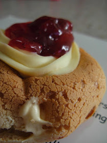 不懂是否越健康的食物味道就越逊色? 第一口的感觉就是有点硬, 必须大力的拉扯才能咬断. 果酱很甜, 带酸的乳酪味道蛮重的, 而奶油夹心却很清淡. 本来三者合一的话就能中和彼此过重或过淡的味道, 只可惜在猛力的咬扯之下, 泡芙上面的点缀就会轻易的脱落, 要不就弄得满嘴油腻.