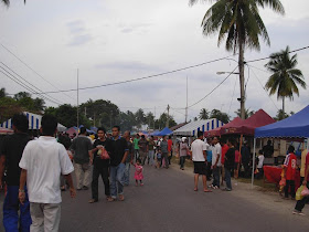三只猫像只盲头苍蝇随处乱逛, 根据路牌转入基惹市( Pekan Kijal)就看到不远处有个小型的斋戒月市集, 没留意路名, 只记得附近一带都是甘榜屋椰子树, 而路口处有间回教堂.