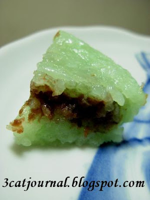 用了拉米叶(Daun Rami)上色的黑龟粿最吸引喵喵的目光, 因为没试过呀! 黑龟粿有花生、椰丝和绿豆蓉口味, 喵喵只选了花生口味的, 内馅的花生碎又多又香又不会太甜, 很适合三只猫的口味.