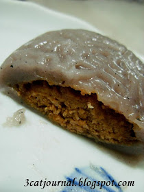 用了拉米叶(Daun Rami)上色的黑龟粿最吸引喵喵的目光, 因为没试过呀! 黑龟粿有花生、椰丝和绿豆蓉口味, 喵喵只选了花生口味的, 内馅的花生碎又多又香又不会太甜, 很适合三只猫的口味.