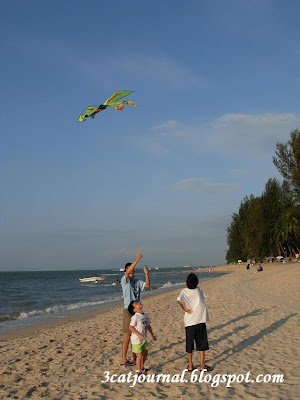 这里有蓝蓝的天空, 蔚蓝的大海, 还有长长的海岸线, 就是没有洁白无瑕的沙滩. 三只猫都是旱鸭子(爹地和喵仔只有三脚猫泳术), 决不敢投奔大海的怀抱, 加上看到海滩设置的注意告示牌, 更加不敢轻举妄动, 还是在沙滩上放风筝好了!