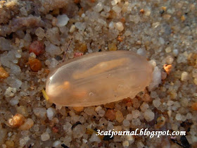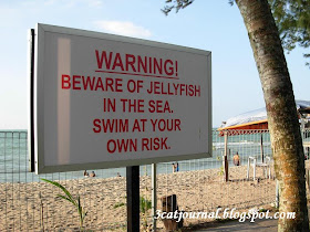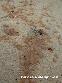 本来光着脚漫步沙滩是件很浪漫的事情, 但右脚一踩, 哔一声, 左脚一踏, 又哔一声, 搞到两脚滑滑, 冰冷, 湿湿又不懂有没有毒素的感觉, 恐怖的很! 喵~
