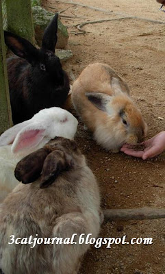 怪不得兔子们都无精打彩,食欲不佳的样子,还是都吃厌了干粮?三只猫试过自备红萝卜,兔子们吃得津津有味,但却被饲养员阻止,只说不能喂兔子吃红萝卜。喵喵抓破头皮都想不通,兔子不都爱吃红萝卜吗?所有童话都酱说的,不是吗?