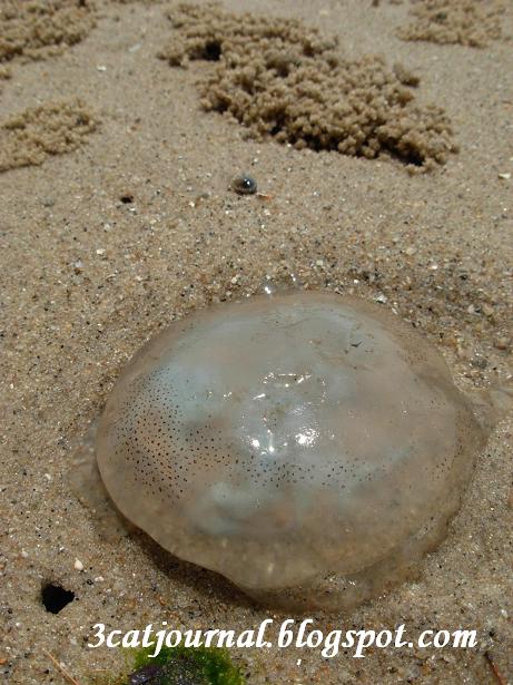 烈热当空的海滩只有三只猫,想必没多少住客晓得这片海滩的存在,沙滩上依稀可见寄居蟹和螃蟹的踪影, 还有一只来不及回家的小水母。喵~