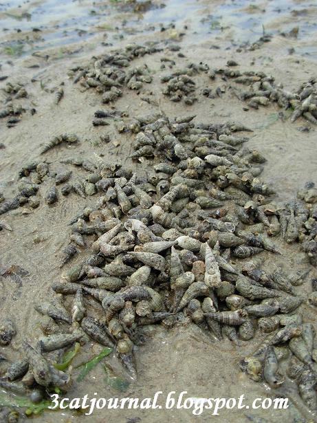 退潮后,海浪静止,只留下一大片的砂石、泥泞和圆锥形的小波螺。