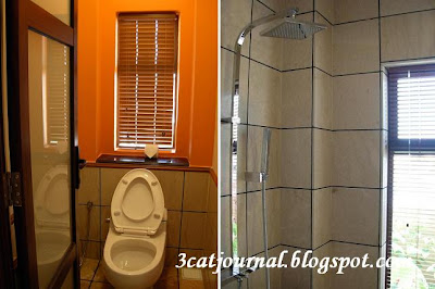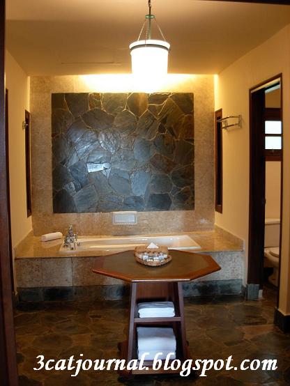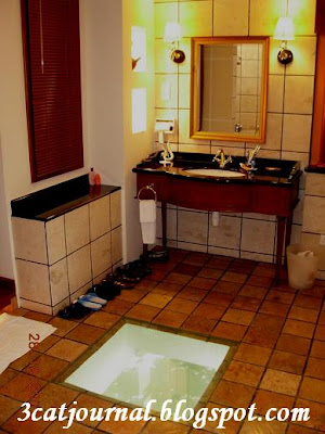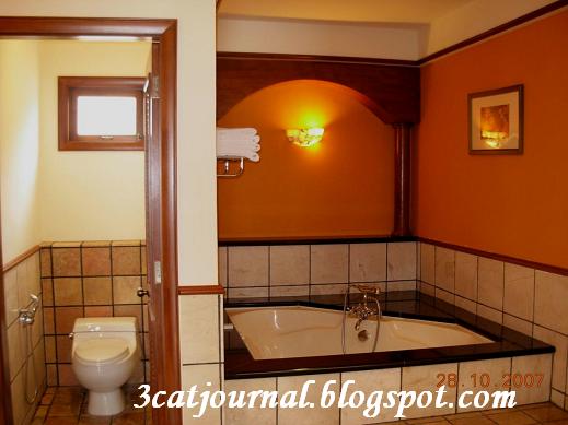 让三只猫惊喜的是浴室非常宽敞兼有气派,右边为沐浴间,浴缸置中,卫生间就在右边,室内施备齐全,不怕没地方挂湿衣服(一般酒店的问题)。