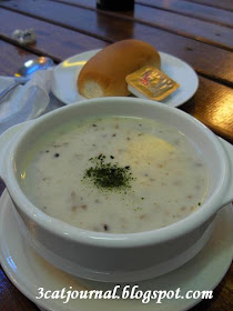 配蘑菇汤的餐包烘得热热的,抹上的牛油迅速溶入餐包,喵仔一口接一口,偶而沾点蘑菇汤,吃得不亦乐呼。蘑菇汤的味道如何喵喵没什么印像,总之都被喵仔喝光了。