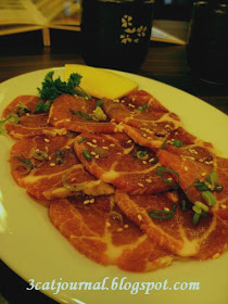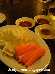 一坐下,服务员即刻递上菜单和送上红萝卜、包菜及每人2碟酱料。带咸的豆瓣酱是拿来沾蔬菜吃的,而另一碟则是沾肉类的,味道偏甜。