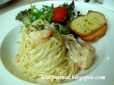 起初看到价格RM9.90就觉得难于置信,原来份量很少,而且是天使发丝意面(Angle Hair Pasta),海鲜也只有虾只,蘑菇奶油的味道还可以,但天使发丝意面就少了应有的韧度和Q感。