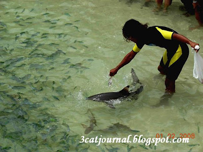 水手大哥逗着鲨鱼玩了一会才把鱼饵往它们咀里送, 鲨鱼们也很温驯的轮流讨吃. 三只猫看到不远处有游客在浮潜, 一点也不担心鲨鱼的存在. 过后, 大家就自由活动直到再次听到水手的召集, 坐小船返礁台为止.