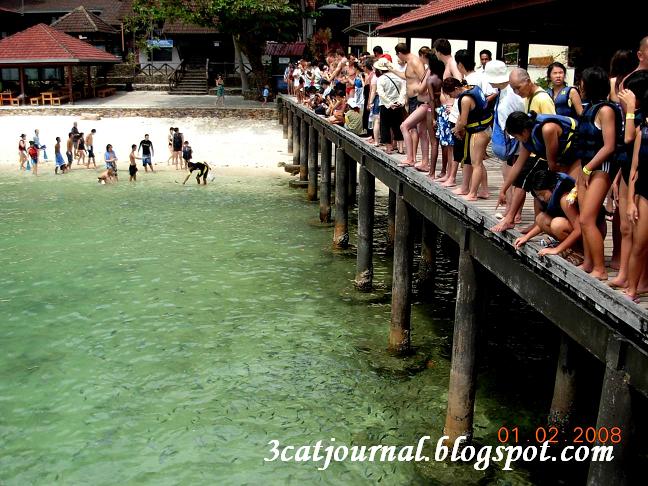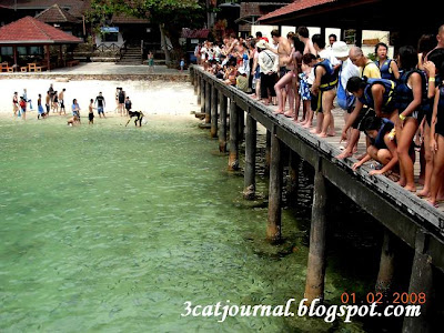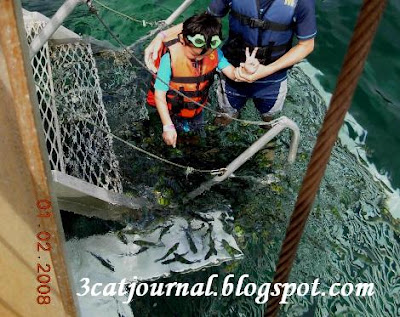 午餐过后, 三只猫终于耍下水了. 不好意思, 因为三只猫都是旱鸭子, 一只只会沉, 一只只会浮, 加上一只半浮沉. 虽说穿了救身衣, 心里还是忐忑不安, 只好选择坐在礁台两旁的跳板, 把半个身体浸在海水里喂鱼咯!