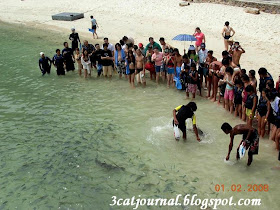 水手大哥逗着鲨鱼玩了一会才把鱼饵往它们咀里送, 鲨鱼们也很温驯的轮流讨吃. 三只猫看到不远处有游客在浮潜, 一点也不担心鲨鱼的存在. 过后, 大家就自由活动直到再次听到水手的召集, 坐小船返礁台为止.