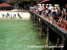 船靠岸后,我们穿过一条长长的水上木长廊,来到了沙滩边的一个大木凉棚下. 三只猫远远就看到一群游客在浅滩围着带头的水手, 好不热闹.