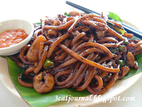 摆在香蕉叶上的福建面油亮发黑,香气扑鼻,让人口水直流。仔细一看它的配料就有鲜虾、鱿鱼、猪肉、猪肝、菜心和猪油渣。