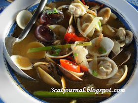 终于开饭了! 第1道乃加了大量洋葱和香茅枝烹煮的“蛤蜊汤”。汤汁鲜甜无比,蛤蜊肉质嫩滑,难怪这里的游客都喜欢自备工具在烈热下往退潮后的沙滩里拼命挖掘啦!