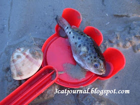 喵喵也试着在稍为退潮的海岸上寻找蛤蜊的踪影,结果只看到浮尸一条,喵仔却很幸运的挖到一只蛤蜊。