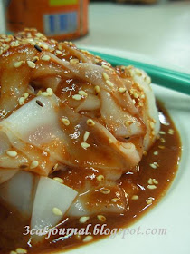 一碟猪肠粉,淋上甜酱、辣椒酱及麻油,再撒上炒香的芝麻,就这么简单。