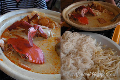 其实, 波德申的“龙虎烩”里没有“嘶嘶”也没有“喵喵”, 有的只是海鲜啦! 微辣偏甜的椰浆咖喱里有一只减了肥的肉蟹、多只鲜虾、中卷、鱼片、炸腐皮和蛮多的冷冻海鲜豆腐, 随锅而上的还有汤熟了的米粉和芽菜.