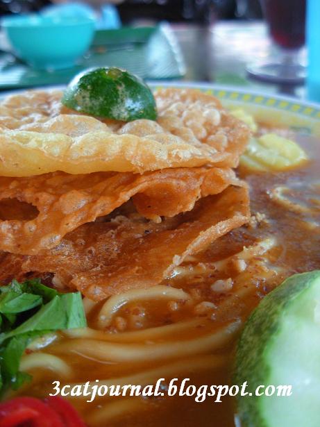 爪哇面的汤底一定要够热,挤上小酸柑,拌匀后吃起来会感觉到一丝丝的香、辣、甜和酸,很有层次感,加上足足有3大片,松松脆脆的虾饼,令人胃口大开,也令喵喵对爪哇面有所改观。