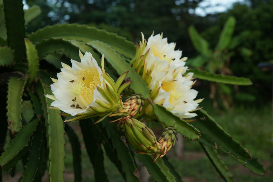 大概已经过了采摘期,只有几株火龙果树的顶端长着火龙果。