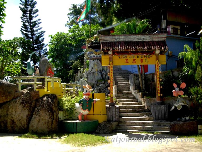 灵慈宫位于直落尼泊(Teluk Nipah),路旁有卖纪念品的小档口,入口处有一只唐老鸭和米奇老鼠欢迎善男信女前往膜拜。庙内外摆放了不少手工粗糙的石雕,尤以大石龟最受游客欢迎,大家都想“寿长百岁”吧!