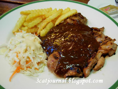 炭烤鸡排的酱汁可选择蘑菇或黑椒,三只猫比较喜欢够香够辣的黑椒汁。