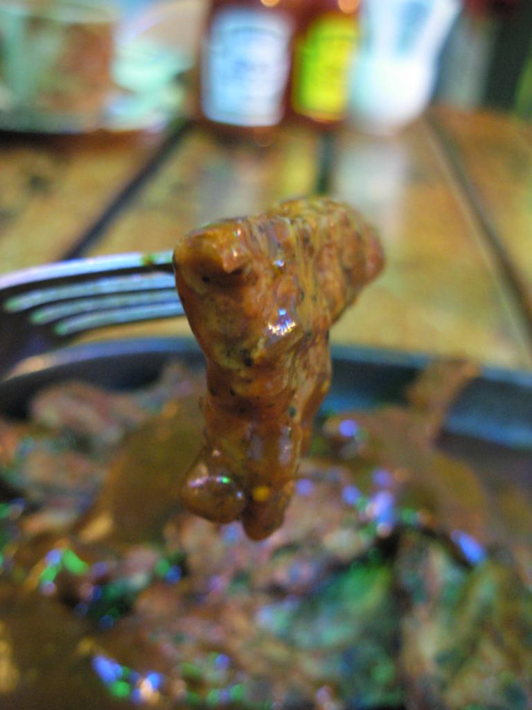 表面经烧烤过的去皮鸡腿肉嫩嫩的仍保留肉汁,微微的炭焦味乃其独特风味,很不错吃。